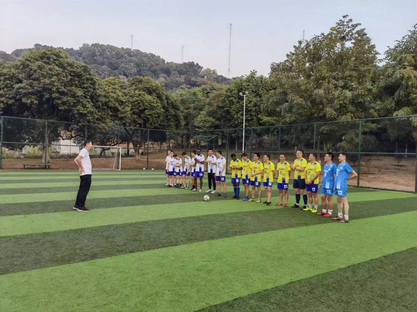 本次比賽參賽隊伍共四隊,分別為化學(xué)/藥物/健康/免疫聯(lián)隊、干細(xì)胞隊、行政支撐聯(lián)隊、省實驗室隊。賽制為:隨機(jī)抽簽兩兩對決,勝者爭奪冠軍,負(fù)者爭奪季軍。開賽前,院足協(xié)主席陳捷凱研究員為此次比賽致辭,對省實驗室?guī)熒膮①惐硎練g迎,感謝球員們對足協(xié)活動的積極參與,希望大家享受此次活動,賽出水平,賽出友誼。
