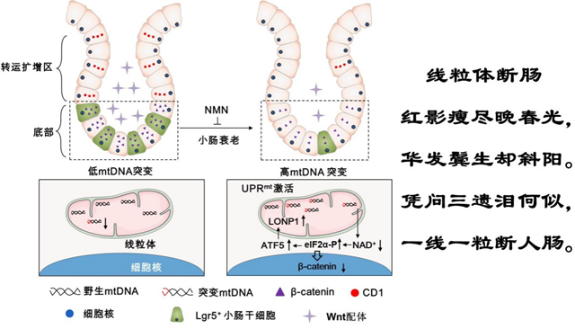 “廉頗老矣,尚能飯否”和“一飯三遺矢”這兩個成語都出自《史記 廉頗藺相如列傳》,分別指的是衡量人的衰老看他的飯量,及短時間內(nèi)跑了三趟廁所說明年老。自古以來,腸道的器官穩(wěn)態(tài)失衡被認為與個體衰老密切相關(guān)。腸上皮是成年哺乳動物中自我更新速度最快的組織,約4-5天更新一次。成年人的腸上皮由形成絨毛的分化細胞和隱窩中的干細胞組成。腸干細胞可以分化為不同的上皮細胞,從而形成有序的腸道結(jié)構(gòu),以維持腸道穩(wěn)態(tài)和吸收、分泌、屏障和抗微生物功能等基本功能。然而,腸衰老的標志物及應(yīng)答信號通路還不清楚。目前認為,線粒體功能障礙是細胞衰老的重要原因。研究表明,老年人類臨床腸道樣本存在線粒體DNA突變的積累。然而,隨著年齡的增長,線粒體DNA突變累積是否以及如何調(diào)控腸衰老?這依然是未知之謎。