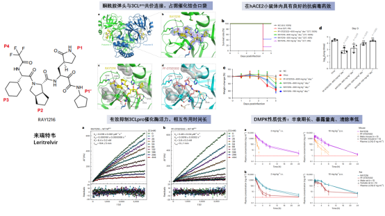 研究團(tuán)隊還在大鼠和小鼠模型上進(jìn)行了來瑞特韋的藥代動力學(xué)測試,在口服灌注或注射且不聯(lián)用利托納韋的情況下,實驗結(jié)果證明RAY1216具有優(yōu)秀的藥代動力學(xué)性質(zhì)。RAY1216在體內(nèi)的藥物血漿暴露量高于對照藥物PF-07321332,體內(nèi)清除率低,代謝半衰期長,其優(yōu)秀的藥代動力學(xué)性質(zhì)表現(xiàn)為其在臨床上的單藥使用提供了有力的科學(xué)證據(jù)。