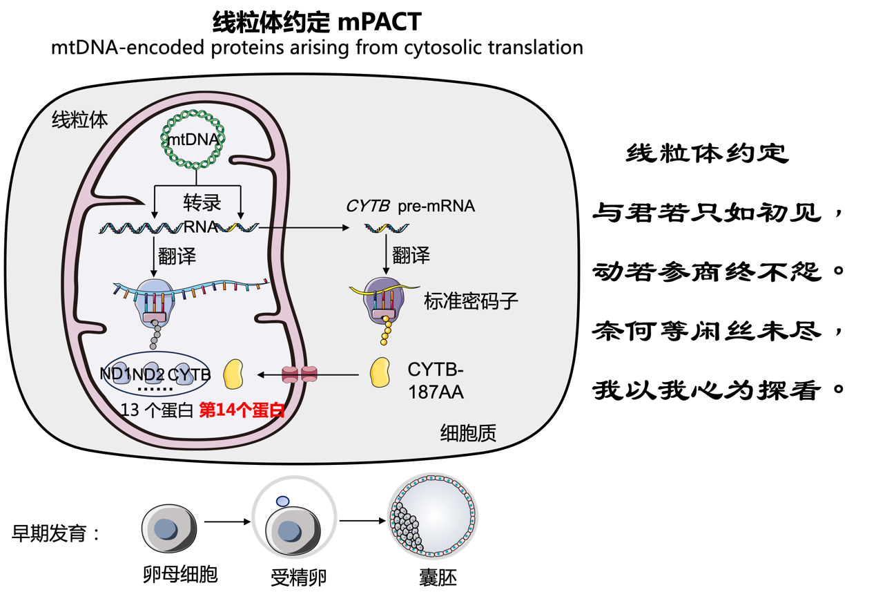 5月3日,中國科學(xué)院廣州生物醫(yī)藥與健康研究院劉興國課題組在Cell Metabolism期刊發(fā)表了題為“A novel protein CYTB-187AA encoded by the mitochondrial gene CYTB modulates mammalian early development”?的文章。該研究發(fā)現(xiàn)并證實(shí),除13個(gè)的線粒體基因編碼的蛋白質(zhì)外,線粒體基因細(xì)胞色素 b (CYTB)可以產(chǎn)生一個(gè)線粒體基因編碼胞質(zhì)翻譯?(mtDNA-encoded proteins arising from cytosolic translation, mPACT) 的新蛋白CYTB-187AA,這一模式的英文縮寫PACT具有“約定”的含義,因此將這一新模式稱為“線粒體約定”。進(jìn)一步揭示 CYTB-187AA在胞質(zhì)翻譯后定位到線粒體基質(zhì)中,通過ATP依賴的方式調(diào)控早期發(fā)育。