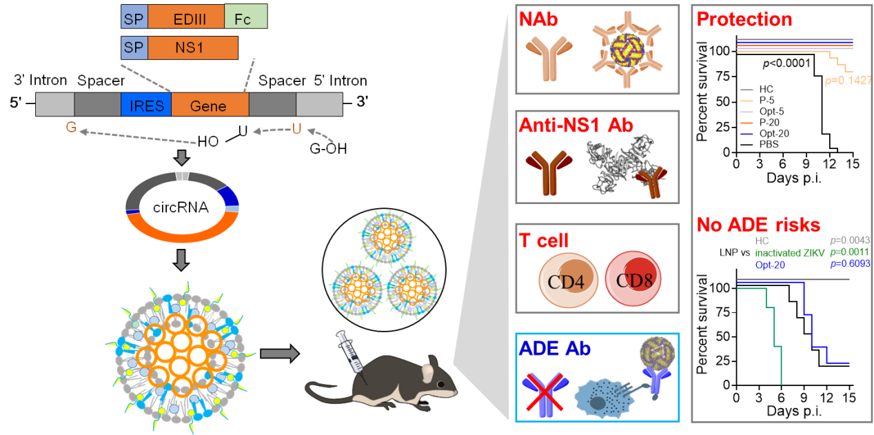 研究結(jié)果表明,編碼EDⅢ-Fc和NS1抗原的circRNA疫苗在“母鼠免疫+仔鼠攻毒”模型及干擾素受體缺陷鼠模型均能有效預(yù)防寨卡病毒感染。重要的是,circRNA骨架的優(yōu)化可提升抗原表達量,優(yōu)化后單劑接種疫苗即可產(chǎn)生有效且持久的免疫保護。在登革病毒感染小鼠模型,該疫苗策略未觸發(fā)登革病毒ADE。該成果不僅為研制安全有效的寨卡病毒疫苗提供依據(jù),也提示circRNA技術(shù)及EDIII-NS1抗原策略有潛力應(yīng)用于登革病毒等蚊媒黃病毒疫苗的研發(fā)。