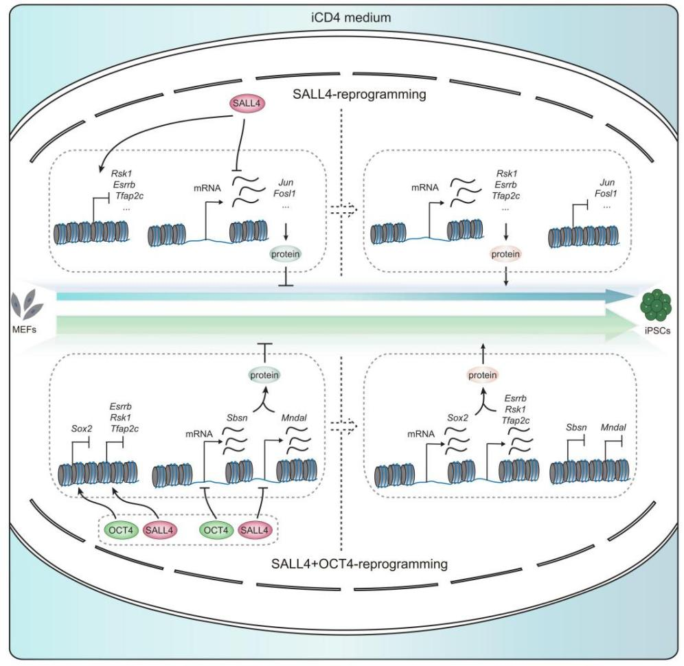 SALL4單因子誘導(dǎo)體細胞重編程及SALL4與OCT4協(xié)同促進重編程機制模式圖