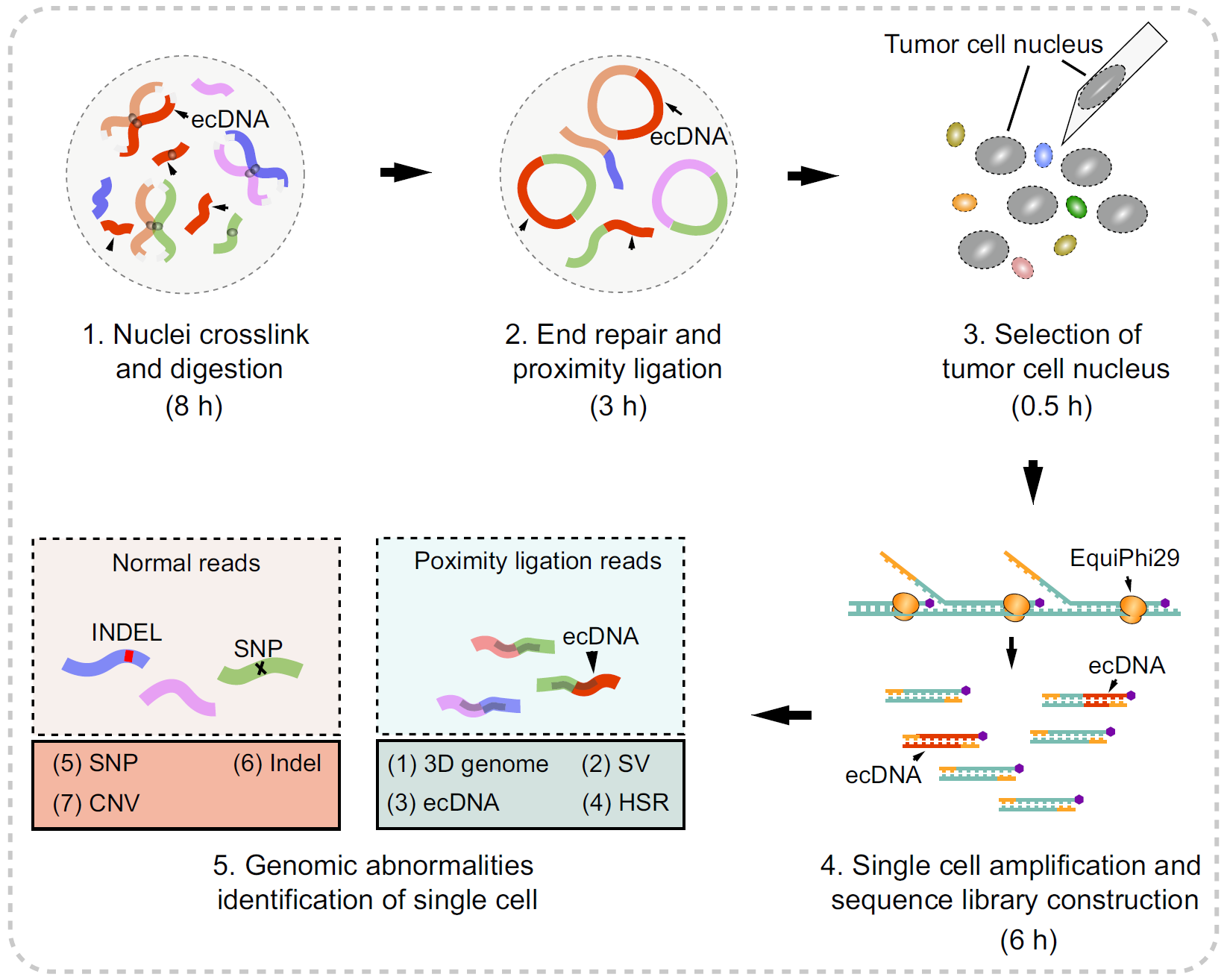 近日,中國科學(xué)院廣州生物醫(yī)藥與健康研究院譜系基因組多維技術(shù)研究組林達研究員在Nature Communications期刊發(fā)表研究成果,報道了新開發(fā)的單細胞多組學(xué)技術(shù)-Uniform Chromosome Conformation Capture(Uni-C)。該方法可在一個細胞中同時解析基因組大尺度結(jié)構(gòu)變異(如SV、CNV、ecDNA)、小尺度突變(SNP/INDEL)以及染色質(zhì)三維構(gòu)象,實現(xiàn)高分辨率、多維度的聯(lián)合分析(圖1)。